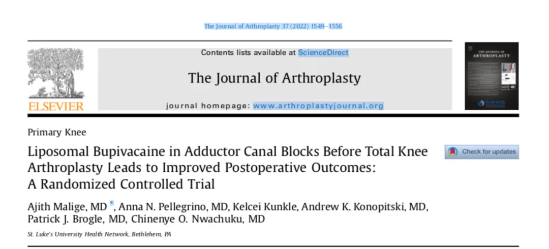 【前沿解读】全膝关节置换术前的收肌管阻滞中使用布比卡因脂质体可改善术后结果:随机对照试验