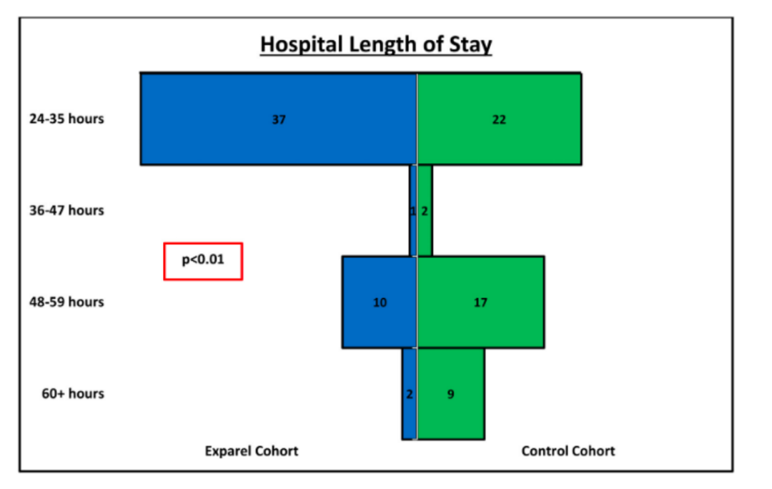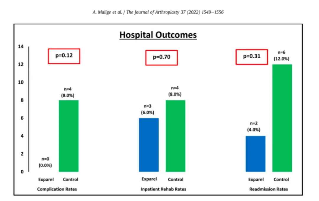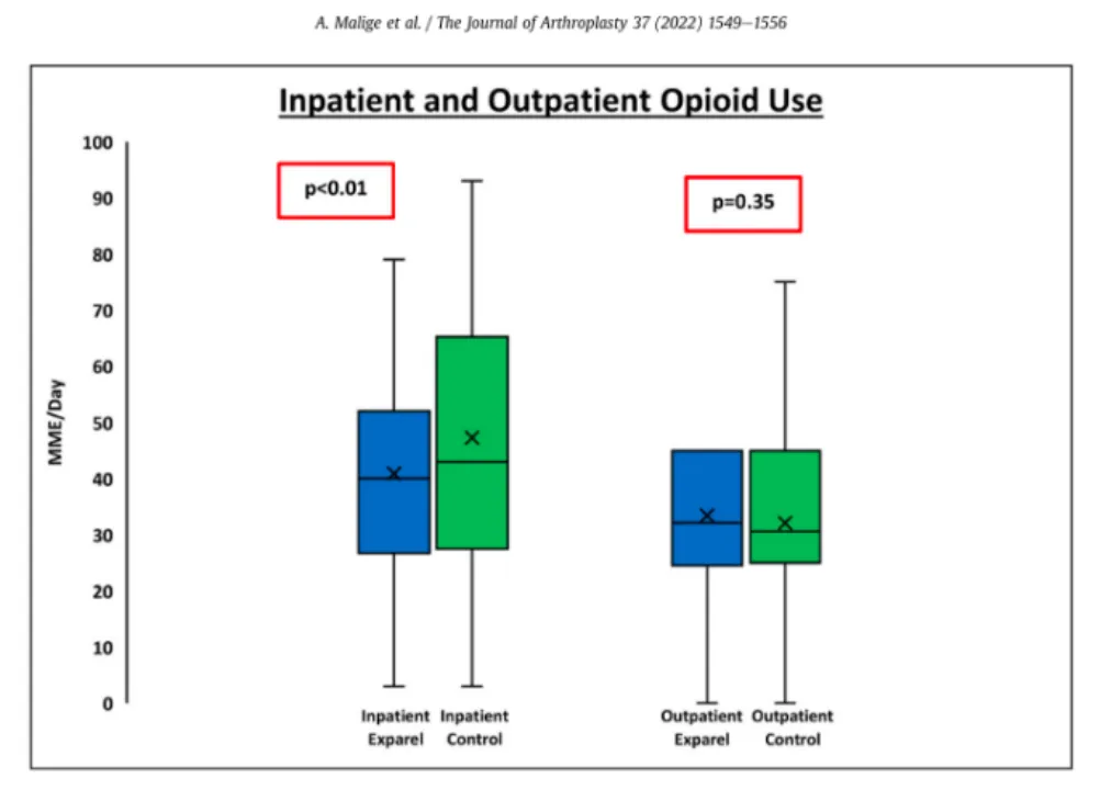 结果显示与对照组相比,试验组住院时间更短(36.3小时vs 49.7小时,P<0.01),住院后需要住院康复治疗的比率没有差异,两组的再入院率相似。与对照组相比布比卡因脂质体组患者,术前疼痛评分与术后第0天的疼痛评分相比,NRS疼痛评分改善量显著增加(1.8 vs -0.2,P<0.01)。试验组的患者在住院期间使用的阿片药物总量显著较低(40.9 vs 47.3 MME/d,P<0.01)。两个队列中的患者需要首次术后给予阿片类药物的时间相似(163.2 vs 169.0分钟,P=0.59),出院后患者在门诊阿片类药物使用量相似(33.4 vs 32.1 MME/d,P=0.351)。最后,试验组相比对照组在术后第1周(20.3 vs 6.0,P<0.01)、术后第2周(31.1 vs 19.6,P=0.02)和术后第6周(48.2 vs 35.7,P<0.01)这些时间点的总WOMAC评分有更加显著的改善,但在4周(36.0 vs 29.7,P=0.2)无显著改善差异。