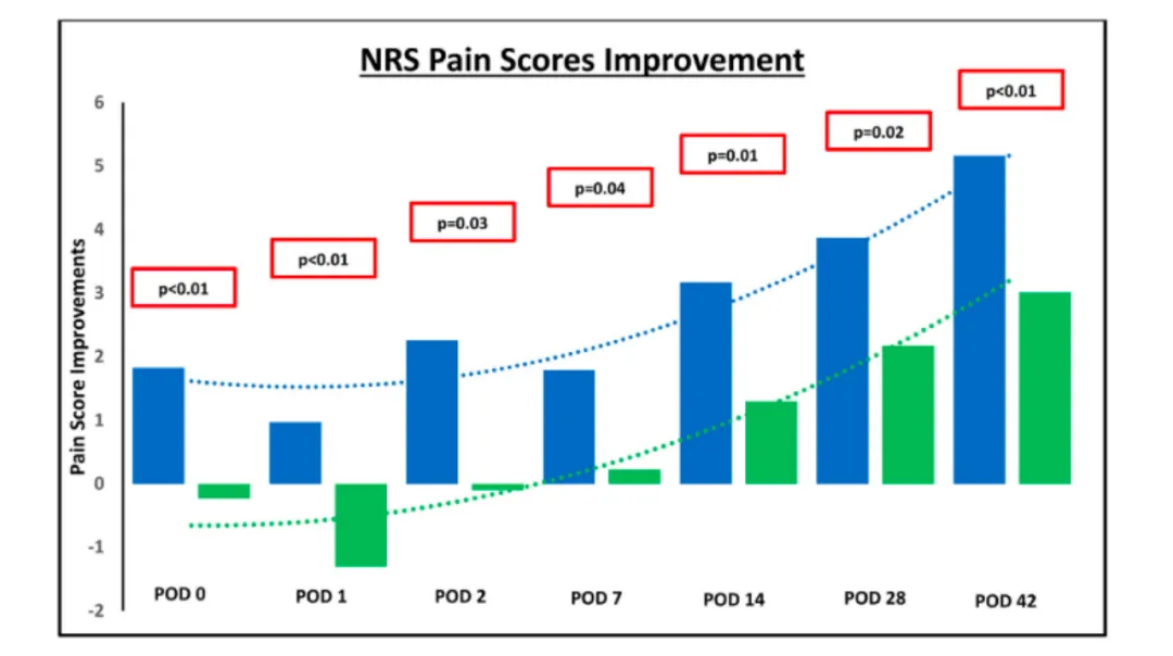 在住院患者(POD 0、POD 1和POD 2)和门诊患者(POD 7、POD 14、POD 28和POD 42)时间点获取分数。积极的改善表明与基线相比疼痛水平降低,而消极的改善表明与基线相比疼痛水平增加。POD 0:术后当天。