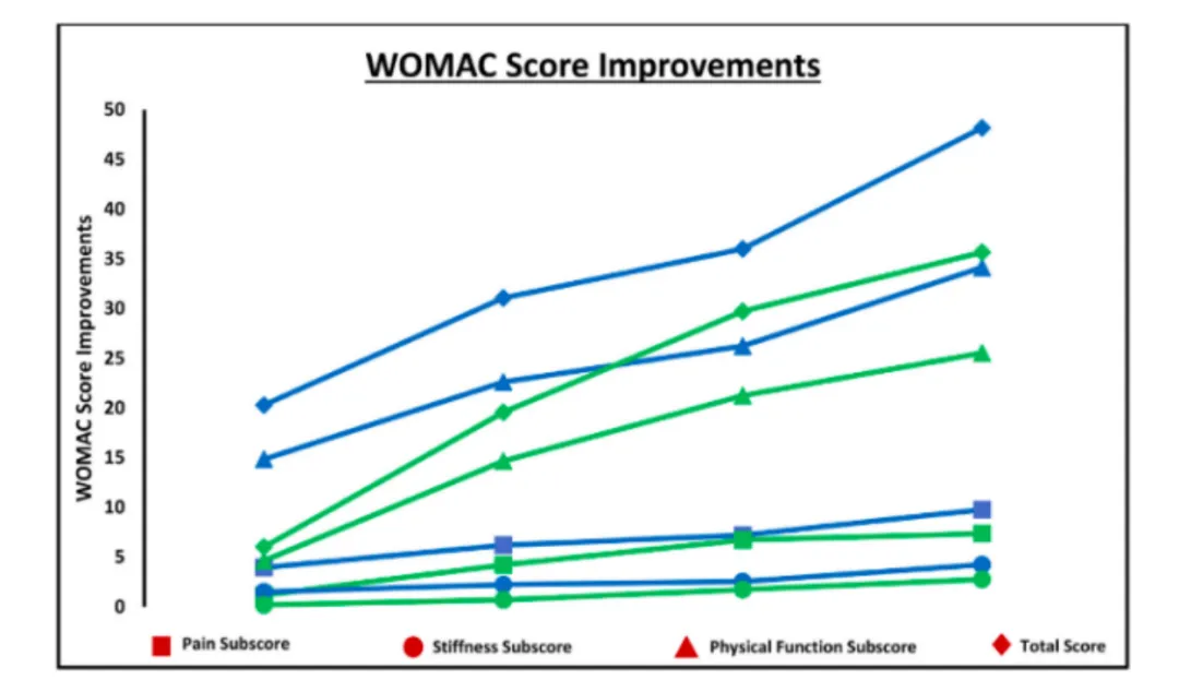 观察指标包括:患者在术前访视和术后不同时间段(1、2、4和6周)的骨关节炎指数 (WOMAC) 评分,NRS疼痛评分、阿片类药物的使用以及住院时间(LOS)。研究结果