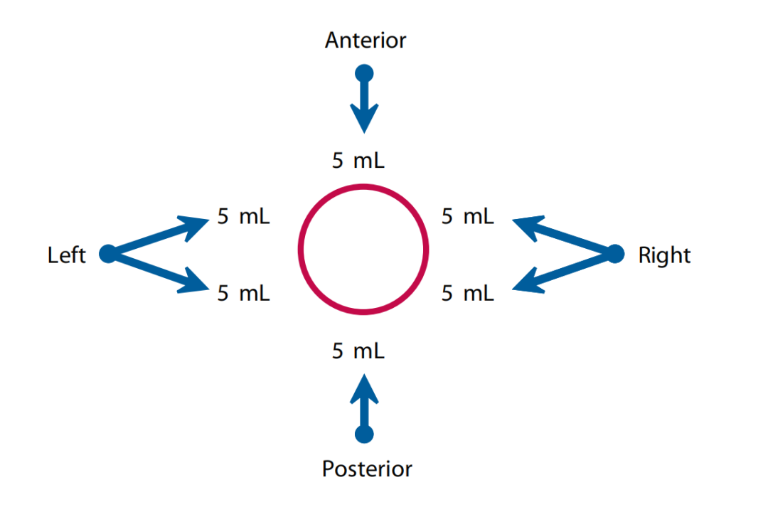 术中给药后(Day1)开始观察,手术在全身麻醉下进行,并在手术过程中按照每个研究中心的实践标准对患者进行监测。对患者、手术团队及研究人员三方进行盲法设置。手术结束时,在肛管外括约肌下方皮下按时钟方向扇形注射一圈,每个点5ml,共30ml(图1)。
