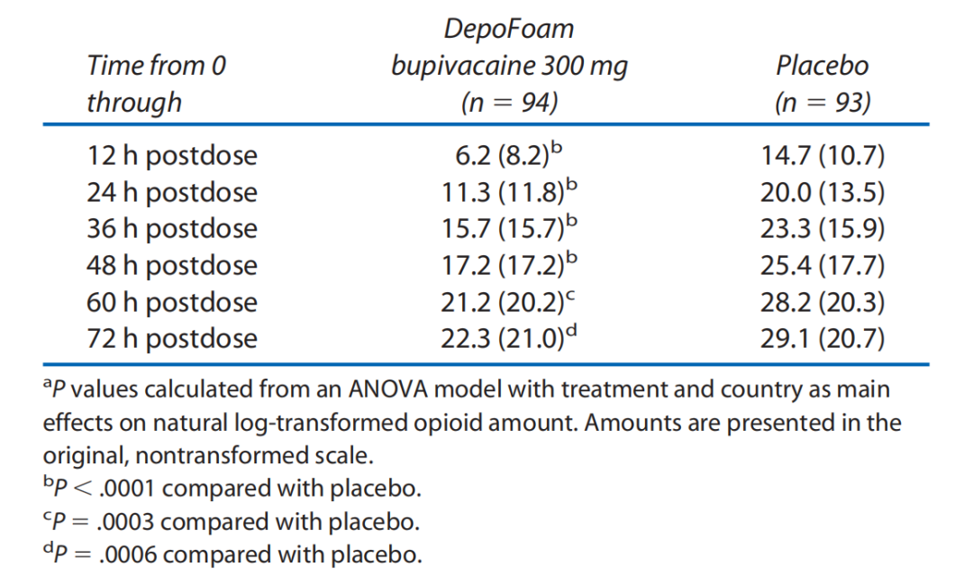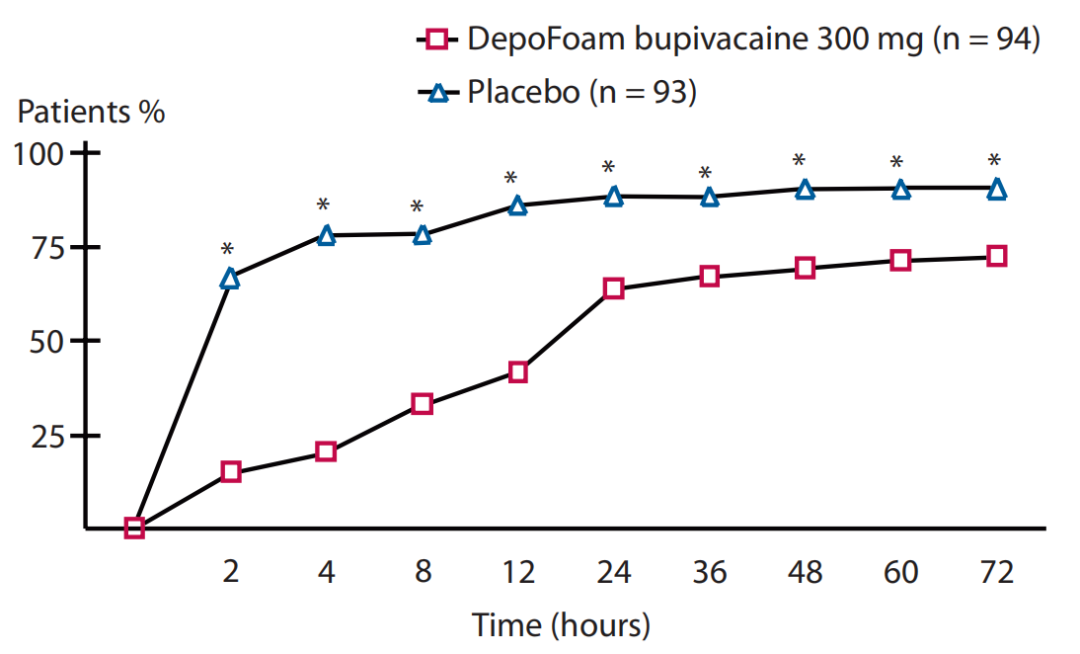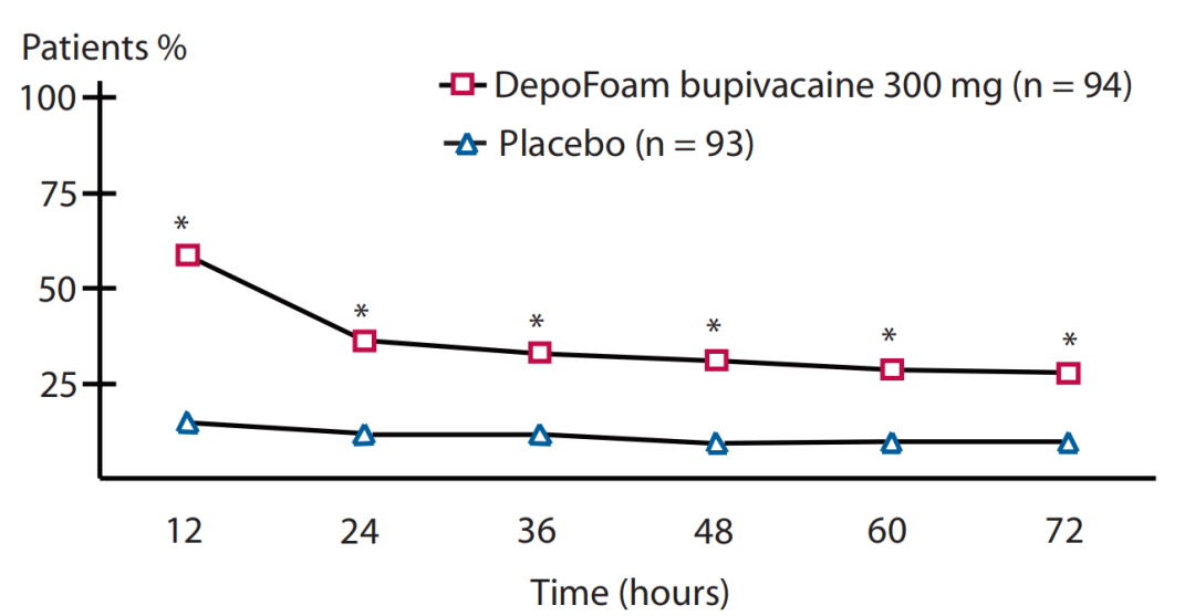 这项前瞻性随机对照试验表明,与安慰剂组相比,局部浸润给予布比卡因脂质体在注射后72小时内可提供优越的镇痛效果。此外,布比卡因脂质体研究组患者比安慰剂组患者阿片类药物需求量更少,延长首次使用阿片类药物的时间,提高患者满意度。