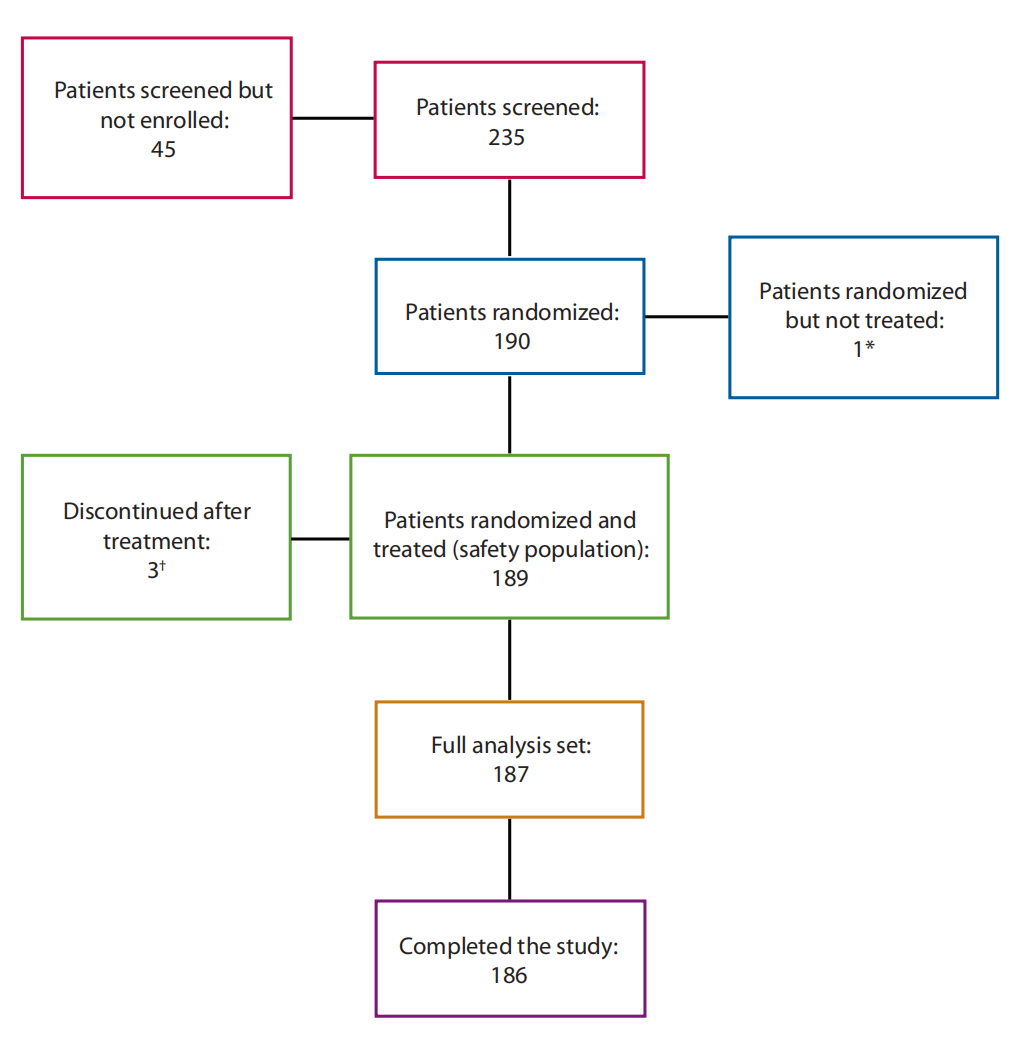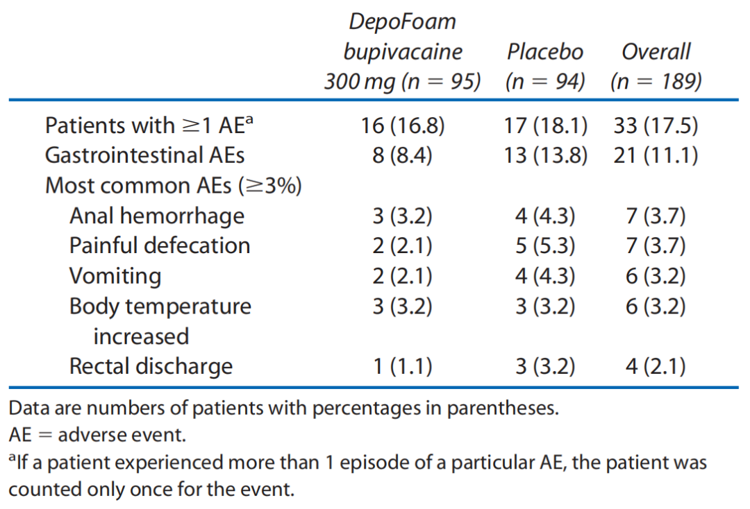 研究结果共纳入189例患者,其中186名完成研究(图2),表1为患者人口统计学资料和基础特征。共33名患者(17.5%)产生治疗相关不良事件,布比卡因组16名(16.8%),安慰剂组17名(18.1%),大部分为轻中度不良事件,常见术后出血、排便疼痛等(Table.3),患者未出现因不良事件退出研究。