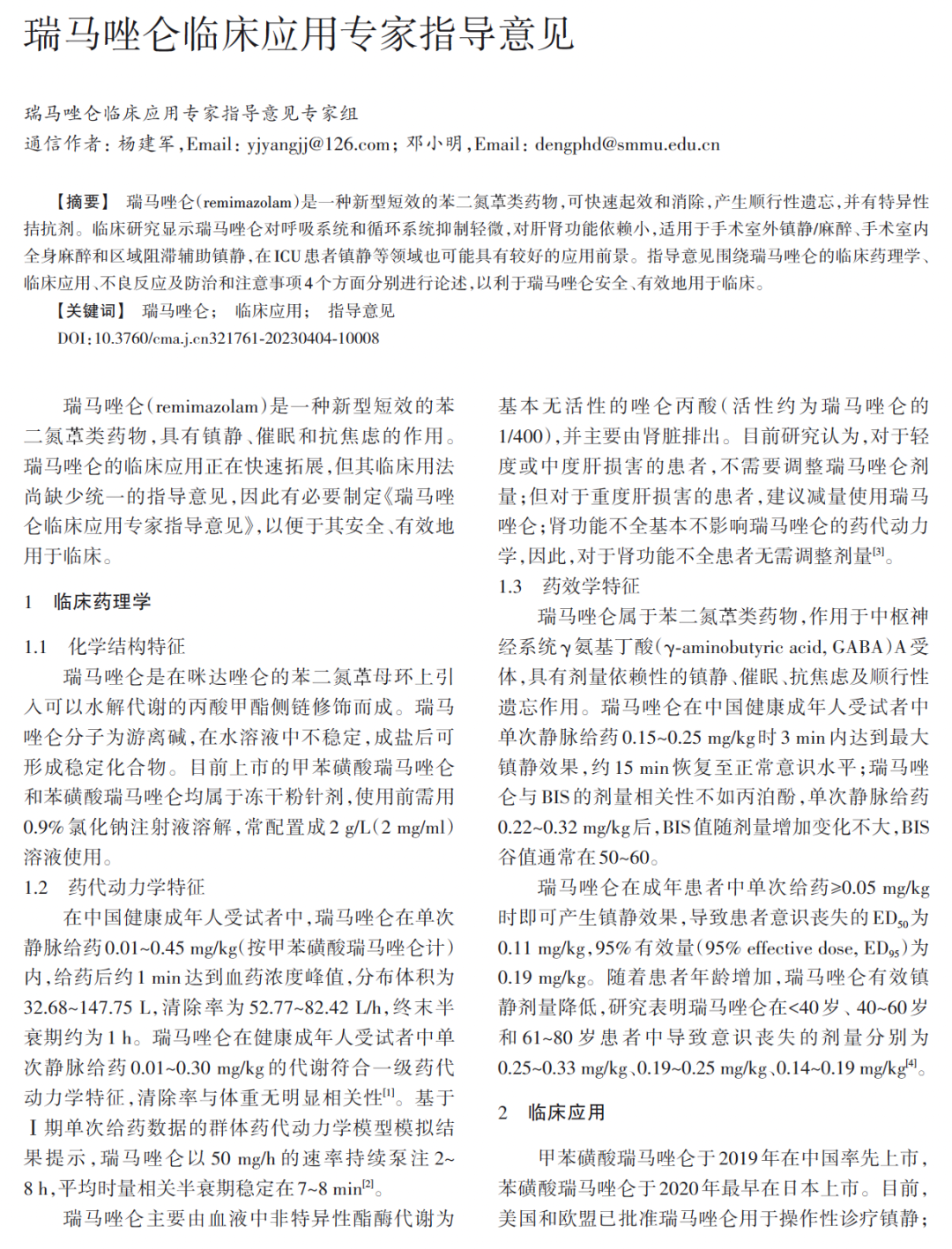 瑞马唑仑(remimazolam)是一种新型短效的苯二氮类药物,可快速起效和消除,产生顺行性遗忘,并有特异性拮抗剂。临床研究显示瑞马唑仑对呼吸系统和循环系统抑制轻微,对肝肾功能依赖小,适用于手术室外镇静/麻醉、手术室内全身麻醉和区域阻滞辅助镇静,在ICU患者镇静等领域也可能具有较好的应用前景。指导意见围绕瑞马唑仑的临床药理学、临床应用、不良反应及防治和注意事项4个方面分别进行论述,以利于瑞马唑仑安全、有效地用于临床。
